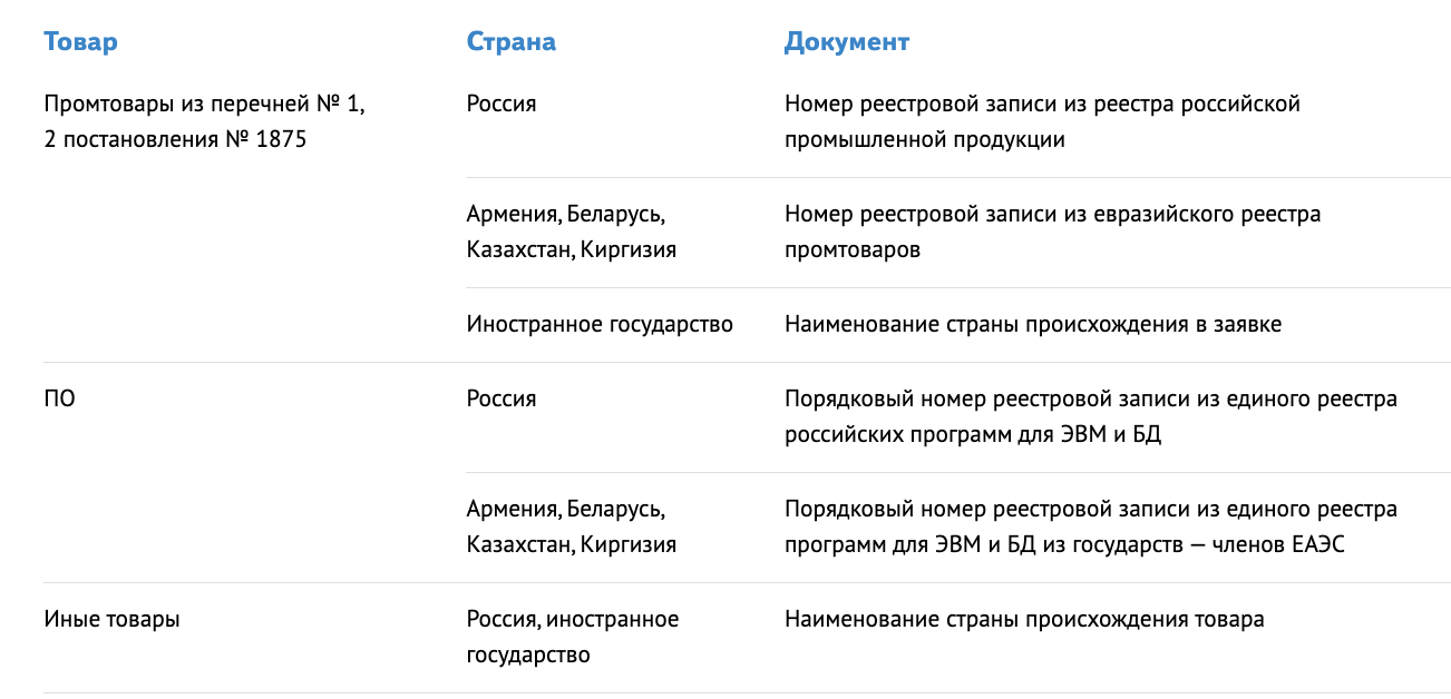 После заключения контракта при внесении сведений в реестр контрактов ЕИС информация о реестровом номере и баллах подтянется. При проведении конкурентных процедур заказчику не потребуется делать это вручную. При заключении контракта с едпоставщиком нужно будет вручную выбрать реестровый номер из справочника и сформировать информацию в реестре. Какой документ использовать в зависимости от страны происхождения товара, смотрите в таблице.