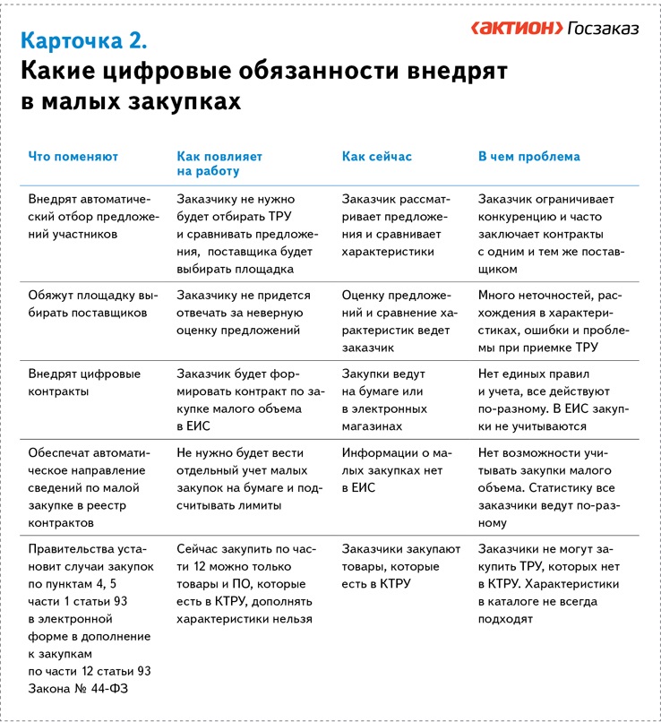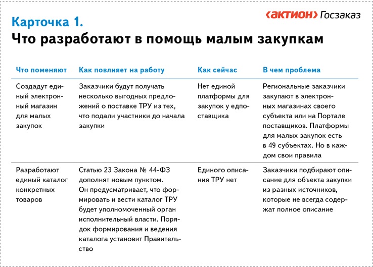 Создадут единый электронный магазин для малых закупок, который будет работать по одному регламенту и единым ценам. Закупки малого объема на единой платформе станут обязательными для всех. Заказчики будут размещать закупку в ЕИС. Операторы площадки отбирать подходящие предложения участников. Поставщики заранее размещать предварительные предложения в едином каталоге конкретных товаров. В течение отведенного времени участники смогут снизить цену. Победителем закупки станет участник с наименьшей ценой. На малые закупки распространят правила контроля в сфере закупок. Изменение смотрите на карточке 1.
