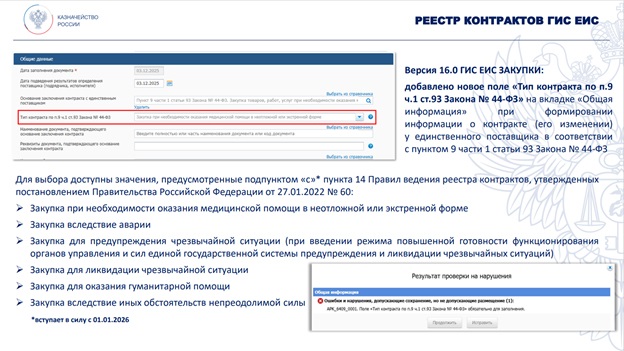 С 1 января 2026 года, если к товару применяется нацрежим, то нужно указать реестровый номер из справочника. Реестры интегрированы с ЕИС, сведения передаются на ЭТП, которые работают по законам № 44-ФЗ и 223-ФЗ.